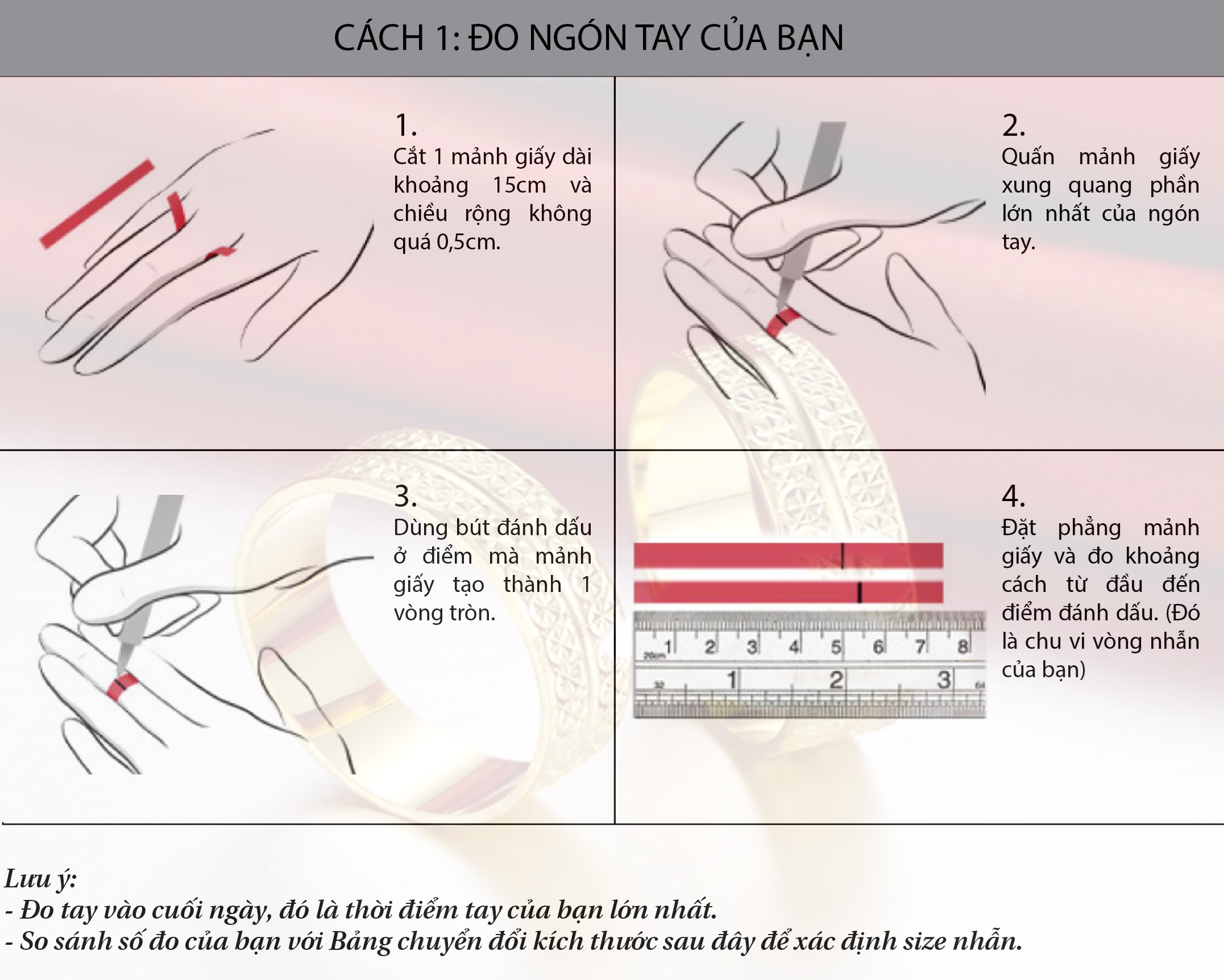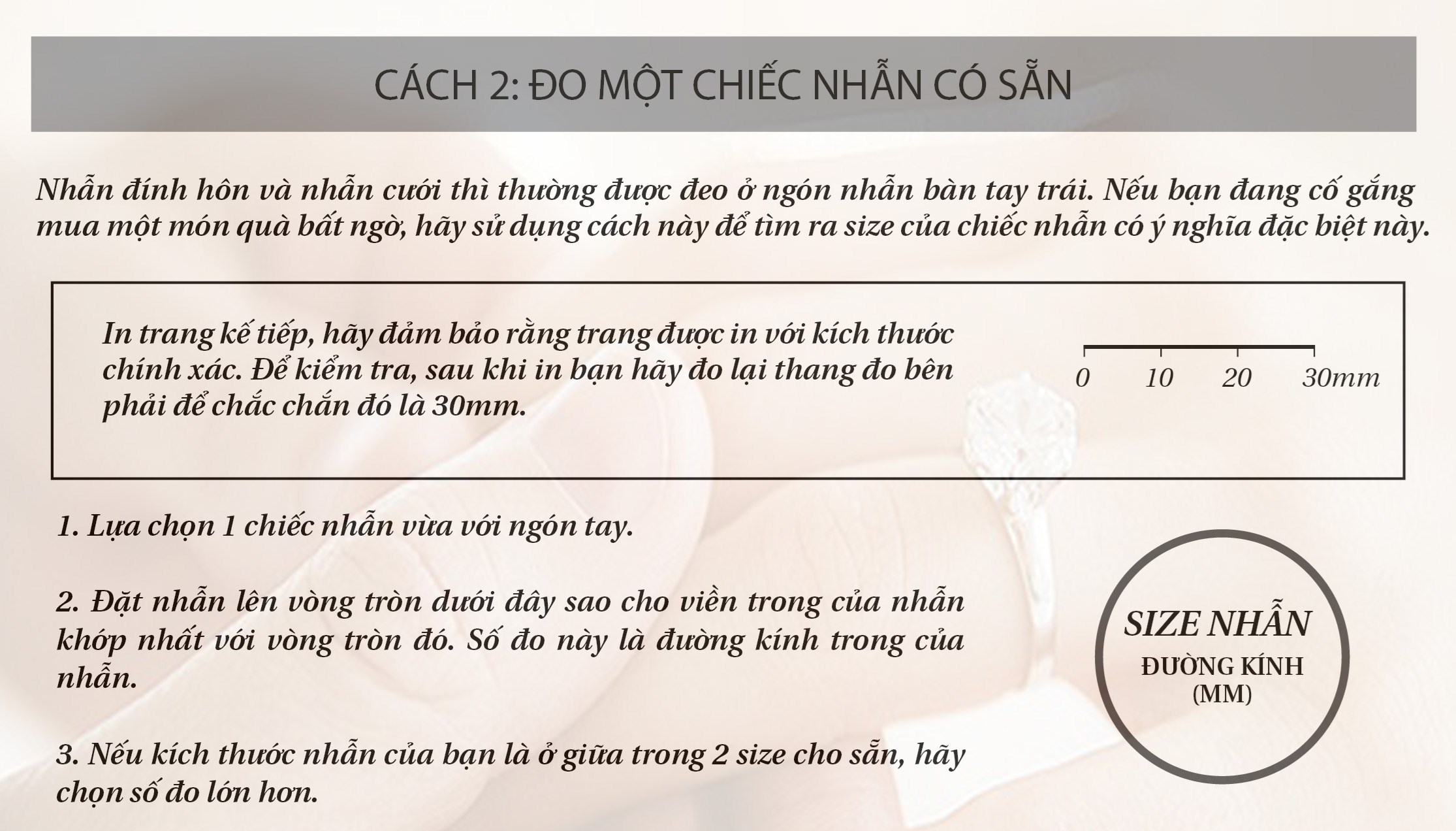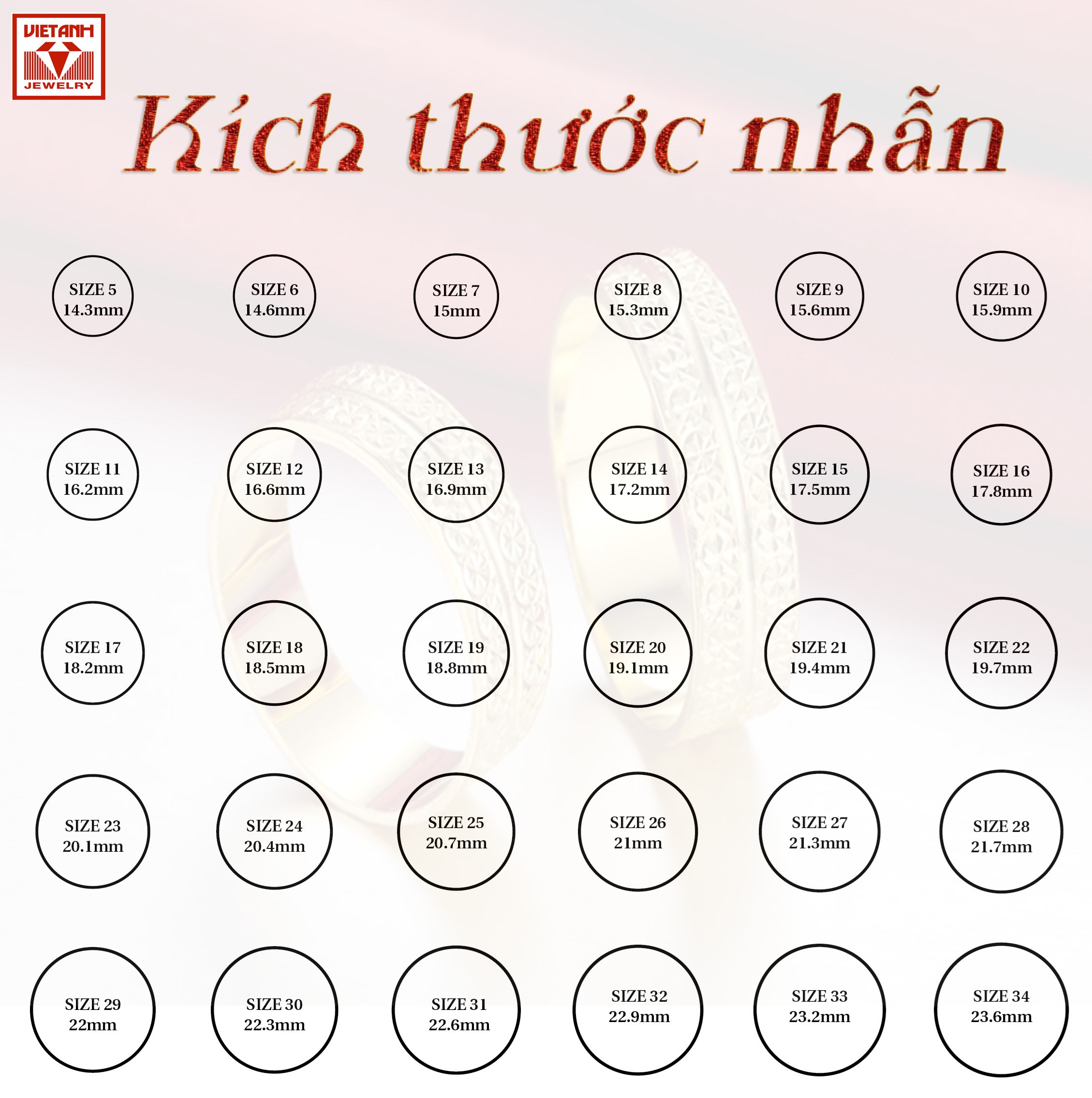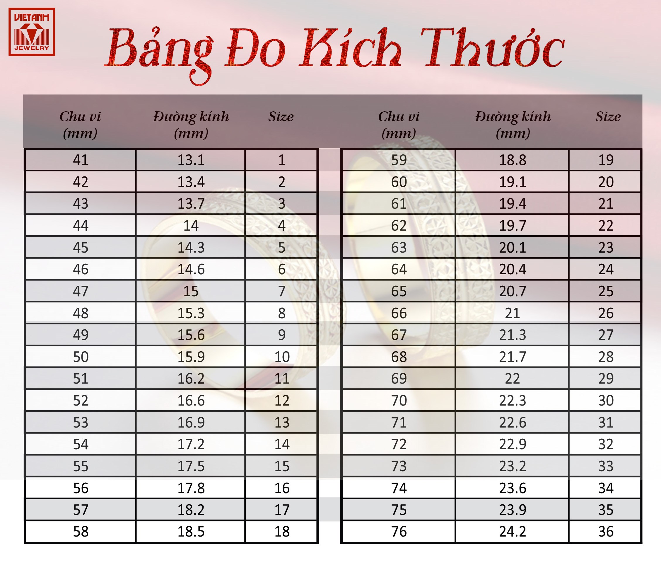 Sau khi đo xong thì hãy đối chiếu với Bảng kích thước phía dưới để tìm ra size nhẫn chuẩn cho mình.