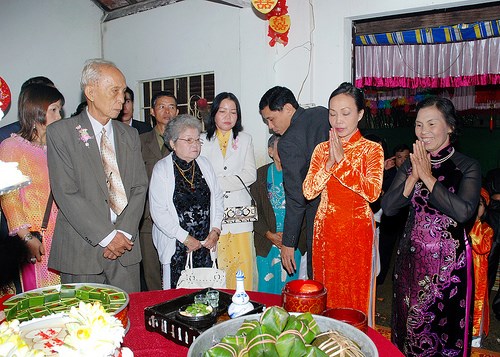 Về đến nhà trai, việc đầu tiên là cô dâu và chú rể được cha mẹ dẫn đến bàn thờ để thắp hương yết tổ (lễ gia tiên), rồi chào họ hàng bên chồng. Sau đó nhà trai mời nhà gái và tất cả những người cùng tham dự tiệc cưới…